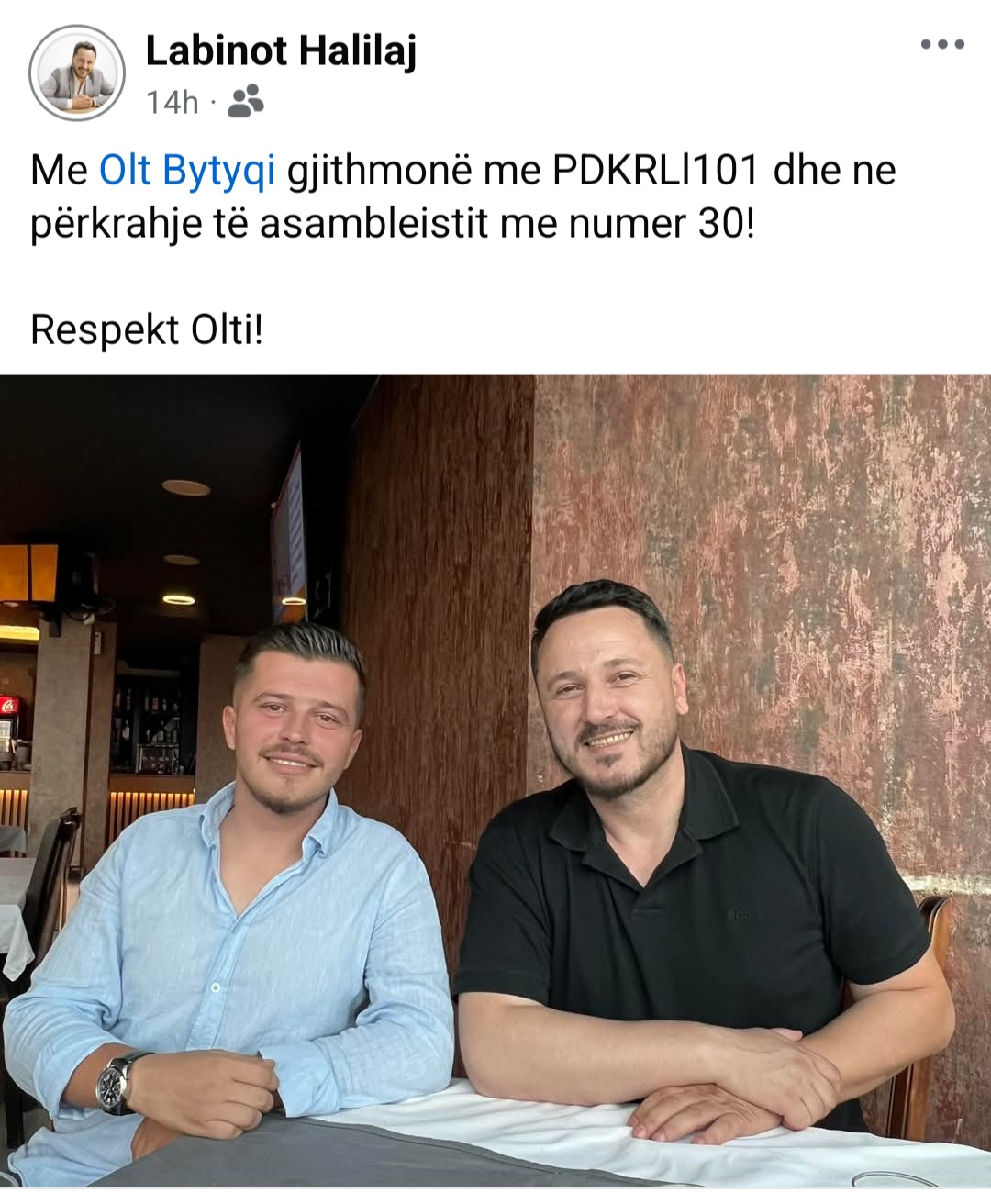 “Me Olt Bytyqi gjithmonë me PDKRLl101 dhe në përkrahje të asambleistit me numër 30! Respekt Olti!”, ka shkruar Halilaj.