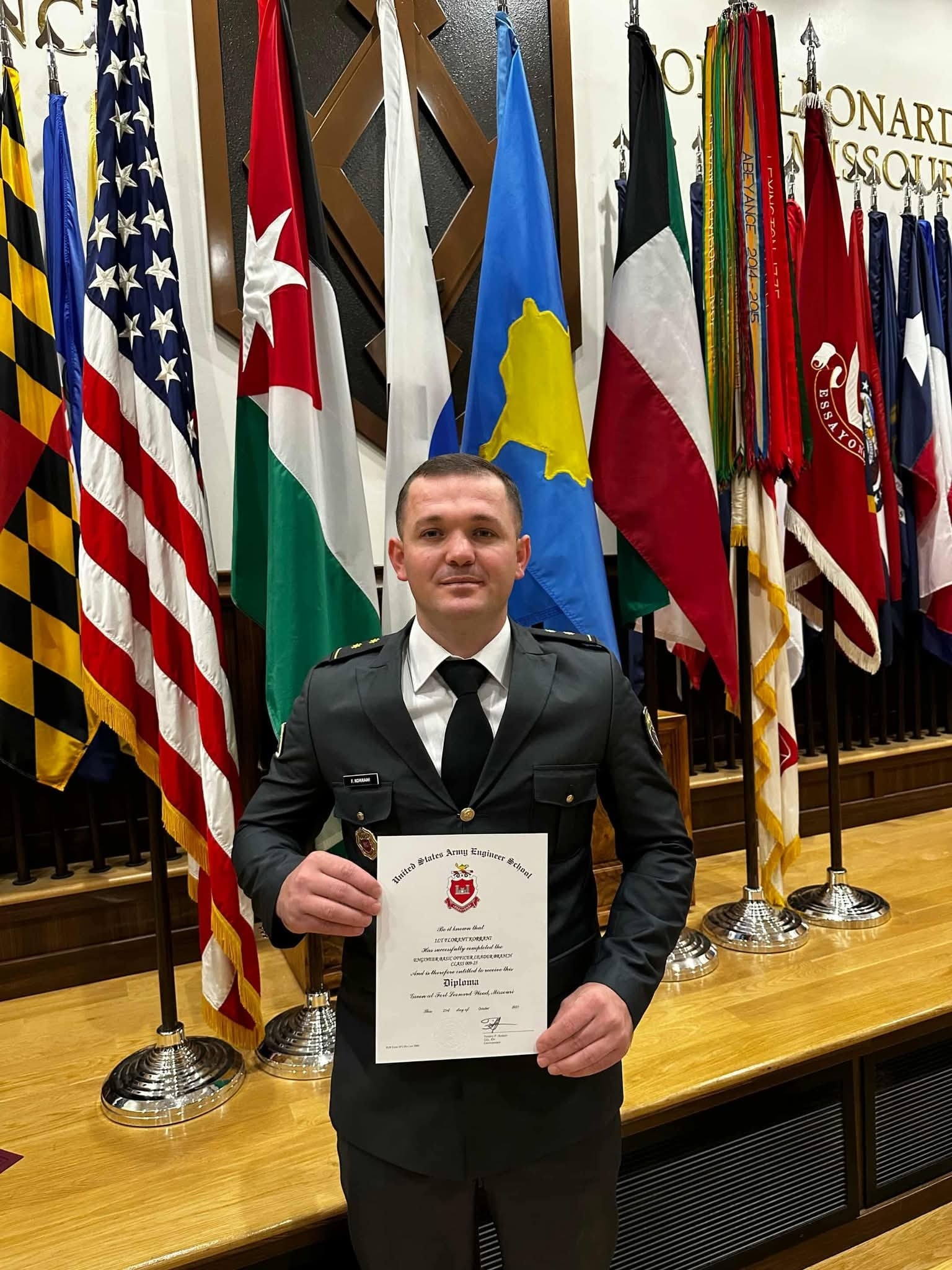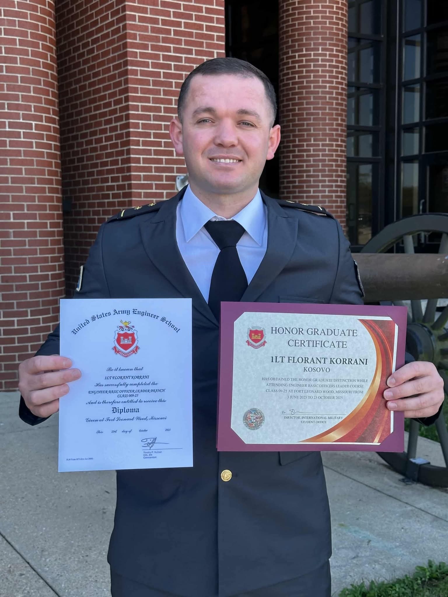 Toger Florent Korrani ka diplomuar në Trajnimin bazik për Inxhinjeri Ushtarake, në Fort Leonard Wood, të Shteteve të Bashkuara të Amerikës.