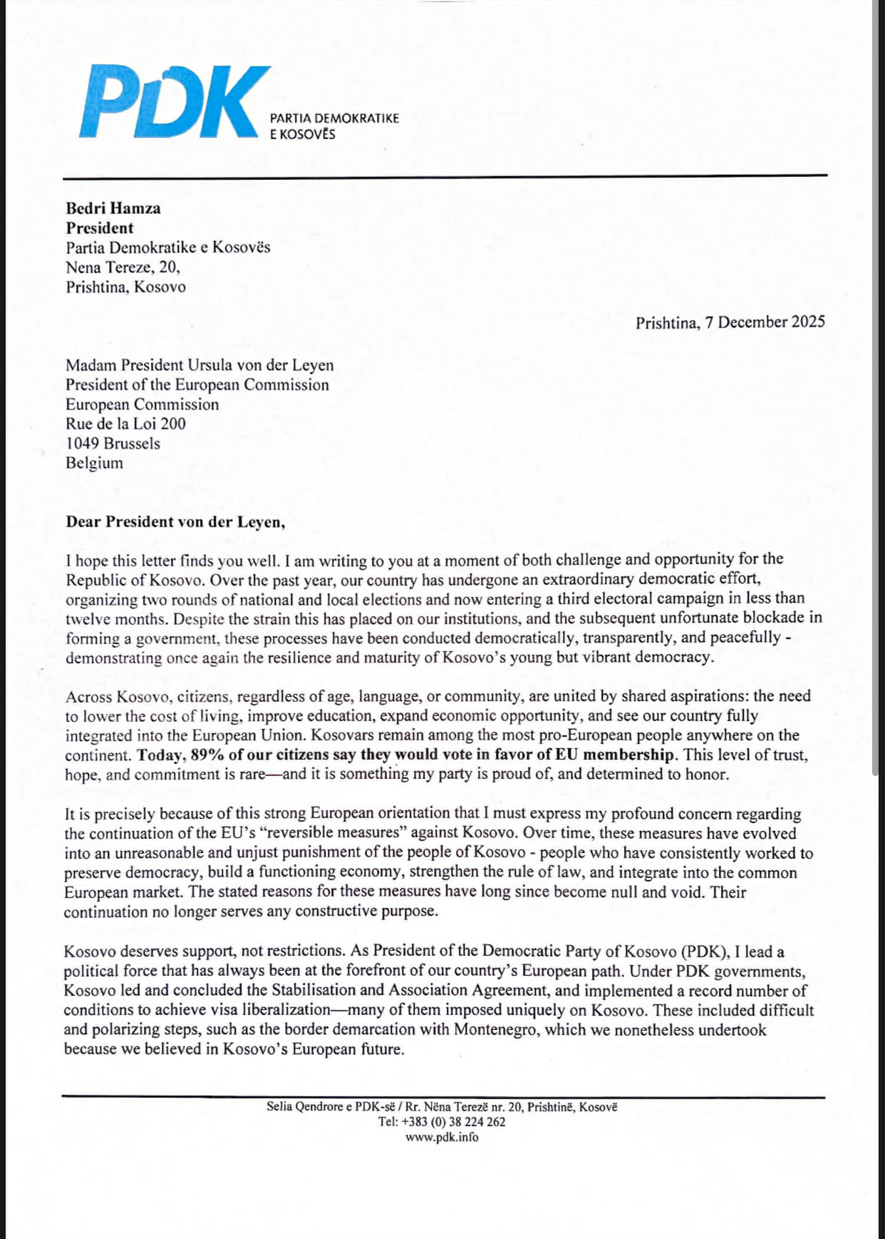 Kryetari i Partisë Demokratike të Kosovës (PDK), Bedri Hamza, ia ka dërguar një letër zyrtare Presidentes së Komisionit Europian, Ursula von der Leyen, ku kërkon heqjen e menjëhershme dhe të pakushtëzuar të masave të BE-së ndaj Kosovës. Në tekstin e letrës bie në sy një qasje që shkon përtej interesit partiak dhe zgjedhor, duke e vendosur perspektivën europiane të Kosovës mbi çdo rivalitet politik.