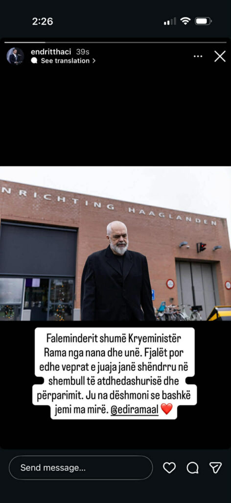 Në një postim në Instagram, Endrit tha se veprat e Ramës “janë shndërruar në shembull të atdhedashurisë dhe përparimit”.