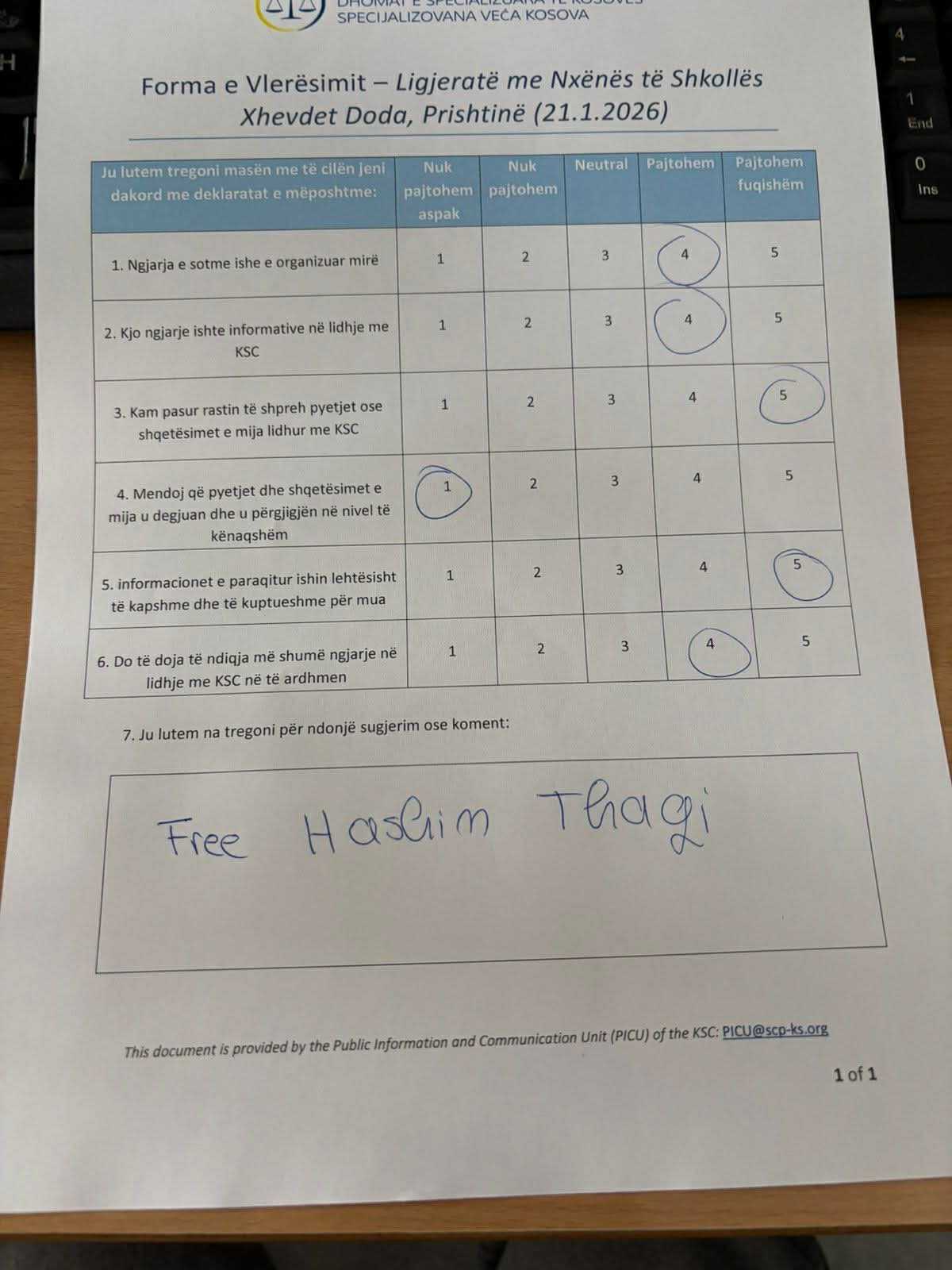 Në fund, tek komentet njëri prej nxënësve ka kërkuar lirimin e Hashim Thaçit.