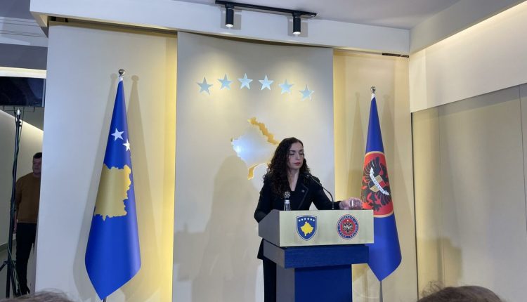 Presidentja e vendit, Vjosa Osmani, po mban një konferencë për media.